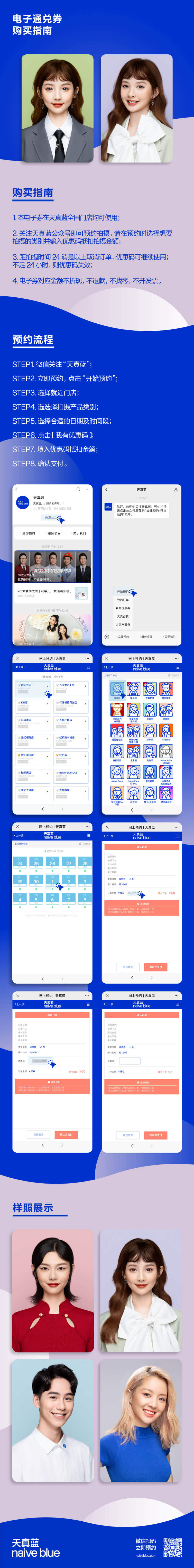 2. 关注天真蓝公众号即可预约拍摄,请在预约时填入优惠码抵扣券面金额。
